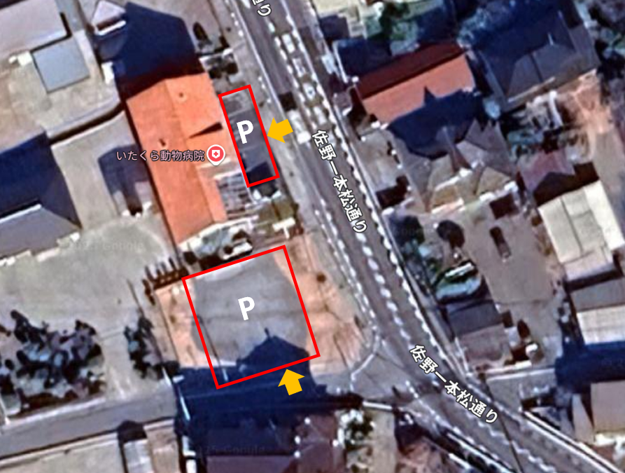病院の東側と南側にあります。黄色矢印が駐車場入り口です。